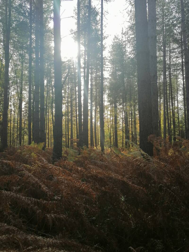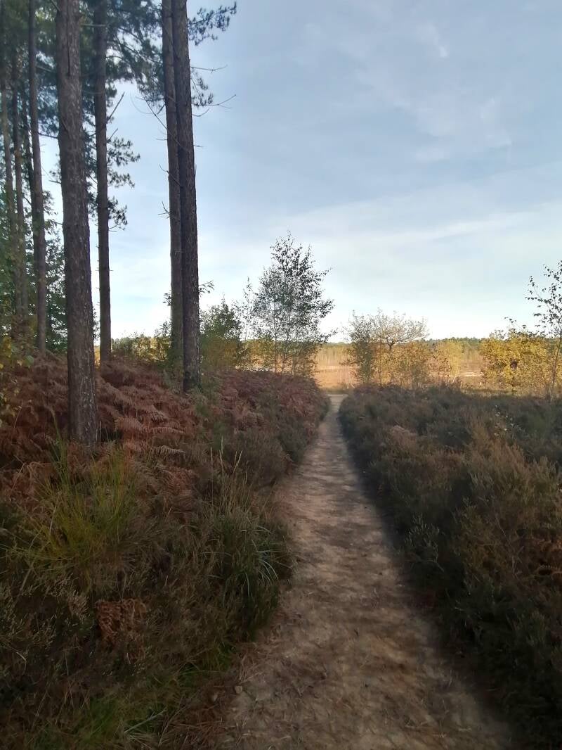 Door de velden, weg van de abdij, sta ik af en toe even stil en draai me om en zie de abdij prachtig in de zon liggen. Al snel wandel ik de bossen in om uiteindelijk in een heidegebied uit te komen. Over knuppelpaadjes, zandweggetjes en bospaden is het heerlijk in het zonnetje.
