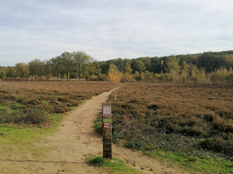 Deze kant van de route is wat heuvelachtiger. Uitgestrekte heidevelden, waterplassen, maar ook bos. Overal gekwetter van vogels.