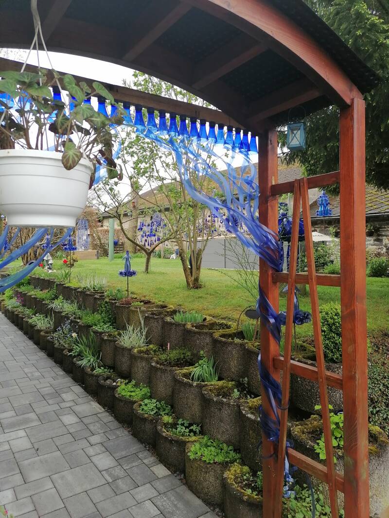 Een bijzondere tuin trekt mijn aandacht. Iemand heeft van blauwe plastic petflessen allerlei kunstvoorwerpen gemaakt. Indrukwekkend.