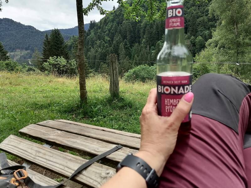 Vanuit het centrum van Sankt Margen is het even zoeken naar de juiste route. Een groot stuk door het bos en dan steil naar beneden tot aan de voet van waterval 1. Wanneer ik eindelijk naar beneden ben gestruikeld bedenk ik dat ik ook weer omhoog zal moeten. Maar eerst even genieten op het bruggetje van het natuurschoon. Over stenen klauter ik weer naar boven en moet ik goed uitkijken waar ik mijn voeten zet. Nu een been breken op deze plek lijkt me niet handig. Als ik boven ben staat er een hut met limonade en een geldkistje en een heerlijke bank.
