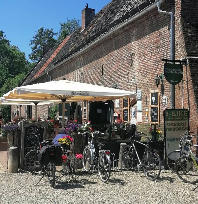 Eigenlijk ben ik toe aan koffie, maar daarvoor moet ik wachten tot ik na 10 km op Gasterij Terborgh arriveer. Een heerlijk schaduwrijk terras en erg gezellig. Het naastgelegen kasteel deed dienst als gevangenis voor de Bokkenrijders destijds, dus ik ben in goed gezelschap :)